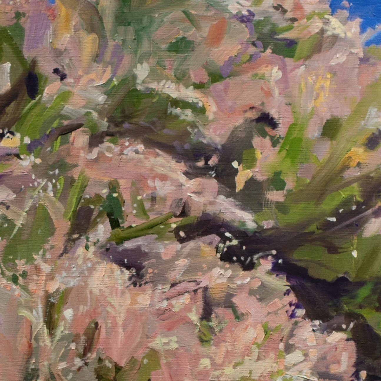 My work is largely about New Mexico and the San Luis Valley of Colorado. I find the beauty of both places almost overwhelming. My response is to limit myself to painting more intimate sites—the arroyo, our garden—and to narrow the larger landscapes, by making smaller landscapes to “contain” the great expanses. I work on site because I see nature as my current collaborator.
